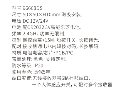 1、无线人体触摸感应调光开关,内置450mA锂电池,可充电; 2、感应距离:1~3cm,延时45秒灭灯,远程控制距离10米内; 3、可调光;